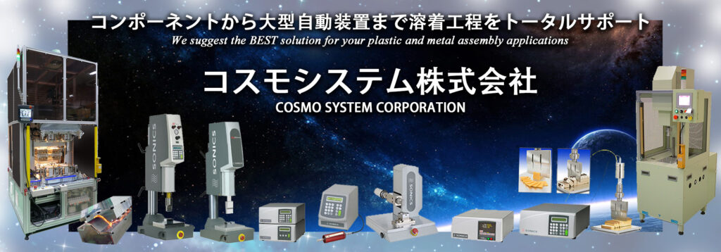 コスモシステム株式会社は、様々な分野で広がっているプラスチック溶着(樹脂溶着)をトータル的にサポートするため、超音波溶着機(超音波ウェルダー)を始めとして、振動溶着機(バイブレーションウェルダー)、熱板溶着機(ホットプレートウェルダー)、スピン溶着機(スピンウェルダー)、赤外線溶着機(IRウェルダー)等の各種プラスチックウェルダー、さらには、銅やアルミ等の非鉄金属の接合に適した超音波金属接合機(超音波メタルウェルダー)、食材をきれいにカットする超音波フードカッターの製造、販売を行っています。